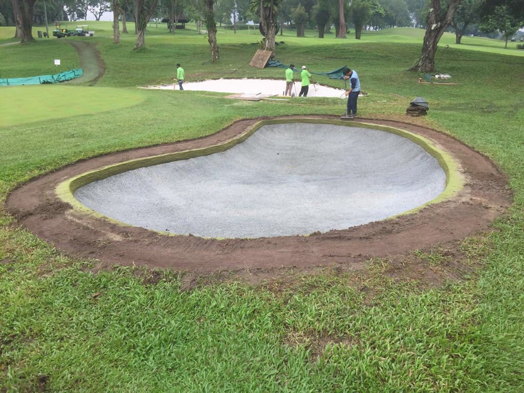 At SICC, Capillary Concrete and EcoBunker have come together to produce bunkers that are fully sealed; lined with Capillary Concrete’s product, and with a low edge produced using EcoBunker’s synthetic solution. Five bunkers have been built under the supervision of EcoBunker’s global installation specialist, Llewelyn Matthews on the short par three 17th hole of the Bukit course, which was the only hole on the course not to be included in a renovation completed in 2017. After the success of this trial work, the club intends to move forward with a similar treatment of all 80 bunkers on its Island course.