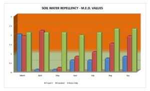 Propel-R in a seven months trial was compared with the industry standard wetting agent and also untreated plots to study the response times of water entering the rootzone and an on-going maintenance of an MED (Molarity of Ethanol Droplet) value below the critical 1.0 level. Note: 0 = no hydrophobicity and 4 = extreme hydrophobicity.