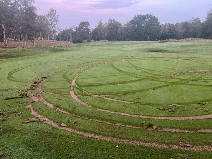 “This morning, one of our courses was vandalised after a car crashed through a set of gates on The Lodge course and continued to try and destroy our third green and 13th fairway.