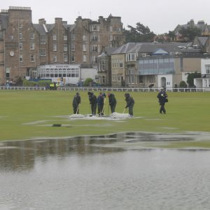 “It has been a very tough morning,” said R&A chief executive Peter Dawson. “It started raining before 5am and we’ve had 20mm since then, 12mm of those in a very short time period and the course started to puddle and flood in certain areas. But if there is any course which can take this is the Old Course at St Andrews.”