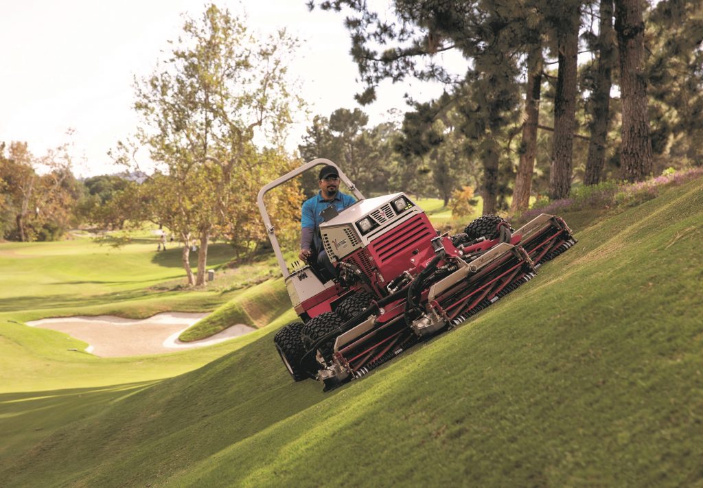 The Contour deck will meet the needs for your bunker surrounds, tee banks and surrounds, first fairway cut and semi-rough, the Reel mower for tees and greens surrounds, the Tough Cut deck for the rough and intermediate areas of heavy growth near woodland margins. The added value is that the machine can operate on 30-degree slopes, allowing you to maintain areas that were previously not maintained.