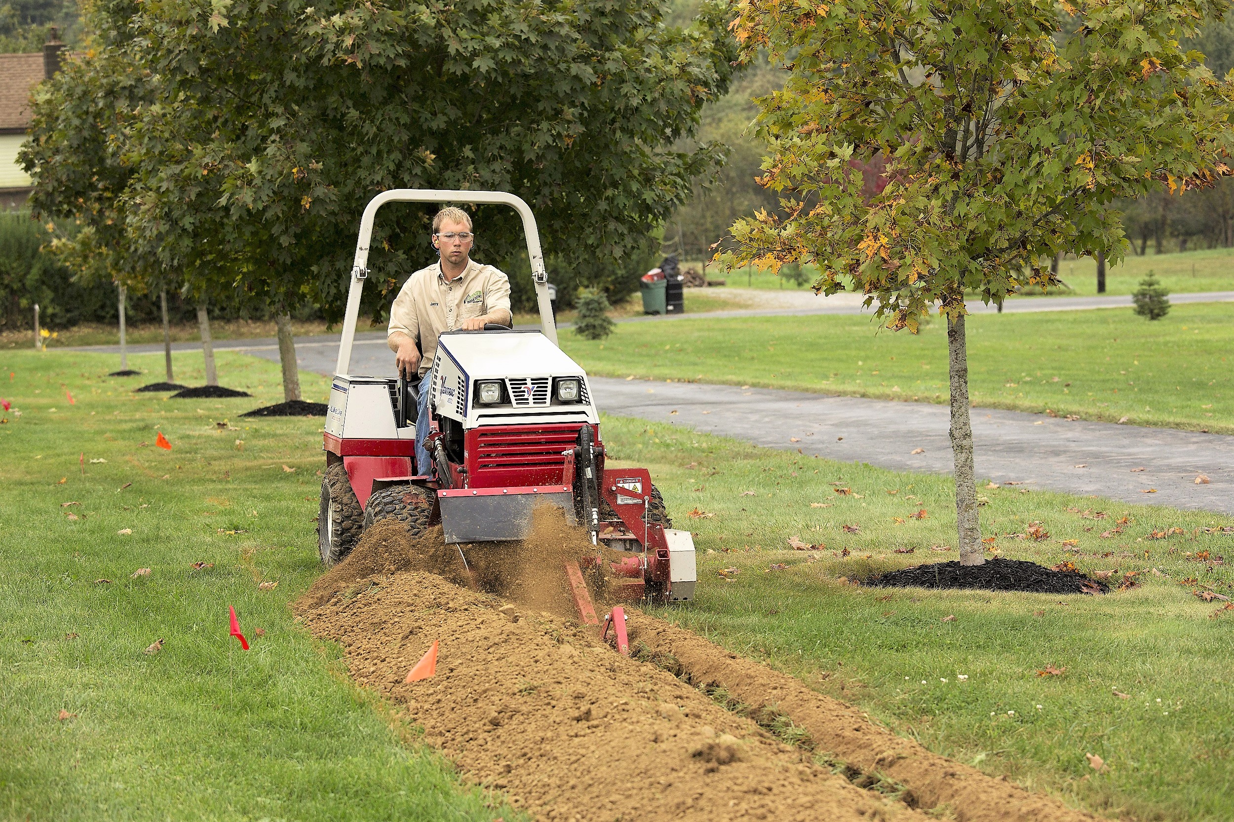 The heavy-duty carbide tips of the trenching chain allow operators to cut through tough terrain, providing excellent performance in a variety soil conditions. The digging teeth bolt onto the chain for easy replacement. The 4500 tractor’s compact design and ground pressure of just 6 psi, allows it to operate the Trencher in tight spaces with minimal turf damage, especially in wet conditions.