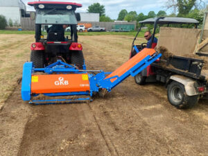 A fleet of orange and blue is forming for the team at Premiership Lawncare, as continued investment sees a bank of equipment from GKB Machines trusted to deliver projects for a growing range of sports turf customers. In the last two years, Owners Josef Farrow and Mark Pettit have purchased a Deep Tine Aerator (DTA), SP100 topdresser, Dragmat and, most recently, a GKB Combinator – enabling the team to expand their range of services to both football and cricket clients.