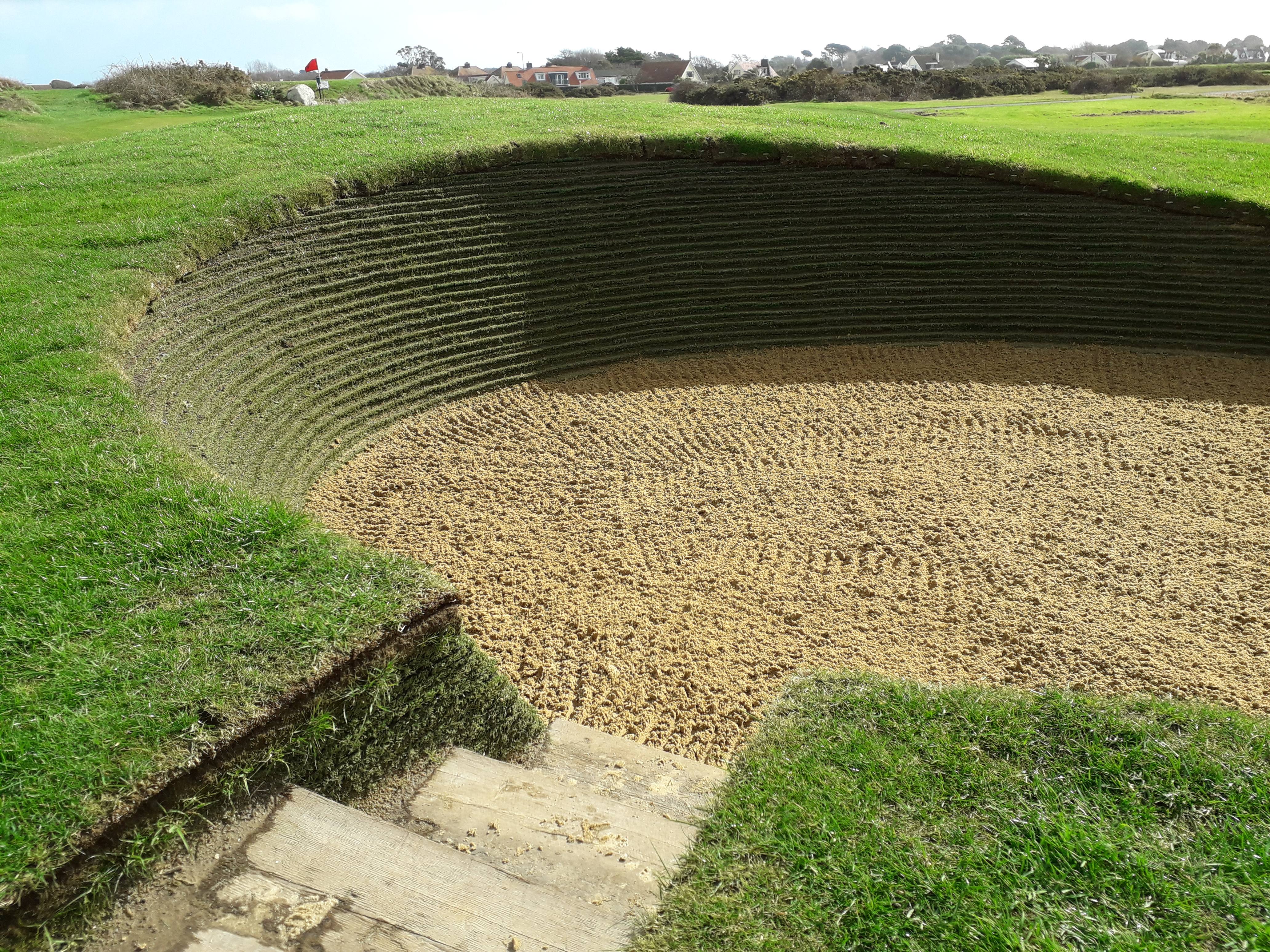 EcoBunker CEO Richard Allen says: “The success of the Royal Guernsey project is a testimony to the effectiveness of our EcoBunker Advanced process, which reduces the weight of turf required to build a bunker by the use of cantilevering and a cement modified backfill. This both strengthens the bunker wall, and dramatically reduces the shipping costs of the product. Had we been forced to use our original method, with wider tiles of artificial turf, the shipping to Royal Guernsey would have required two full trucks. Instead we only needed one; a saving to the club of £2,500 just on the first phase of the project.