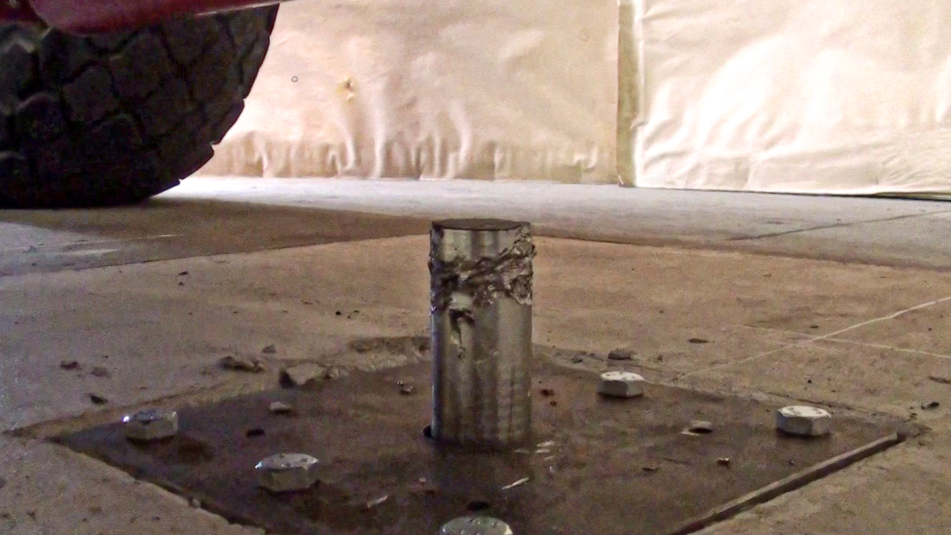 During testing, the mower is surrounded by targets. While the blades are moving, the mower is lowered onto a high-tensile steel bar.