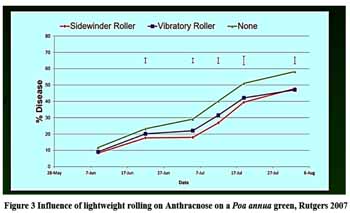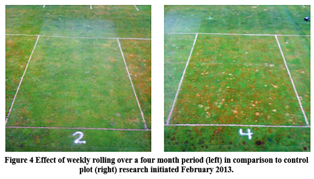 Cultural practices such as rolling, sand topdressing and mowing height can also influence disease incidence and severity. For example, lightweight rolling is a regular feature of greens’ management, carried out primarily to increase speed and improve surface smoothness. However rolling, as shown in research carried out at Rutgers and Oregon State Universities in the US, has secondary benefits of reducing both Anthracnose and Microdochium disease incidence. The figures here show how lightweight rolling can significantly reduce both these diseases, it should be noted that the results reflect the direct action of rolling on dry turf surfaces, so dew removal was not a factor. Light frequent sand topdressing and a change of mowing height of cut from 2.8mm to 3.6mm reduces Anthracnose incidence, this combination of rolling, topdressing and increased height of cut can have a significant effect on Anthracnose pressure without sacrificing surface playing qualities.