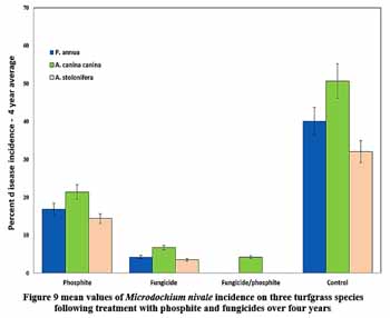 Probably the most intriguing factor on the disease pyramid was the time element. This does not refer to the time of day or even time of year. It involves the time it takes for the pathogen to germinate, to grow and the time it takes to infect the plant. It also refers to the time it takes the plant to recognise it is being infected and the time then for the plant to respond with its biochemical defences. Plants when under attack will respond with a complex array of interconnected defence strategies. Important steps in this defence response are: recognition of the invading pathogen, production of short term defence compounds such as hydrogen peroxide and phenolic compounds, and then generation of signalling compounds which can travel through the plant priming it for further attack. The question for turf managers was, can these defences be stimulated of enhanced? The answer was yes, there are numerous methods or compounds which can be used for this purpose. Phosphite is a prime example of a ‘defence activator’. There is now strong evidence, as can be seen above, that phosphite treatment will reduce disease incidence. Its mode of action is complex and two-fold. Phosphite acts as a fungistat, slowing the pathogens growth in the plant, thus allowing it increased time to respond. Secondly it has been shown that phosphite will directly stimulate production of defence-related compounds prior to infection and that treated plants will have a faster response time when under attack.